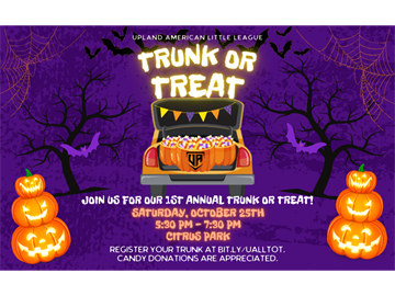 Upland, CA — Get ready for a frightfully fun evening as Upland American Little League invites families to its first-ever Trunk or Treat celebration on Friday, October 25, from 5:30 to 7:30 PM at Citrus Park.